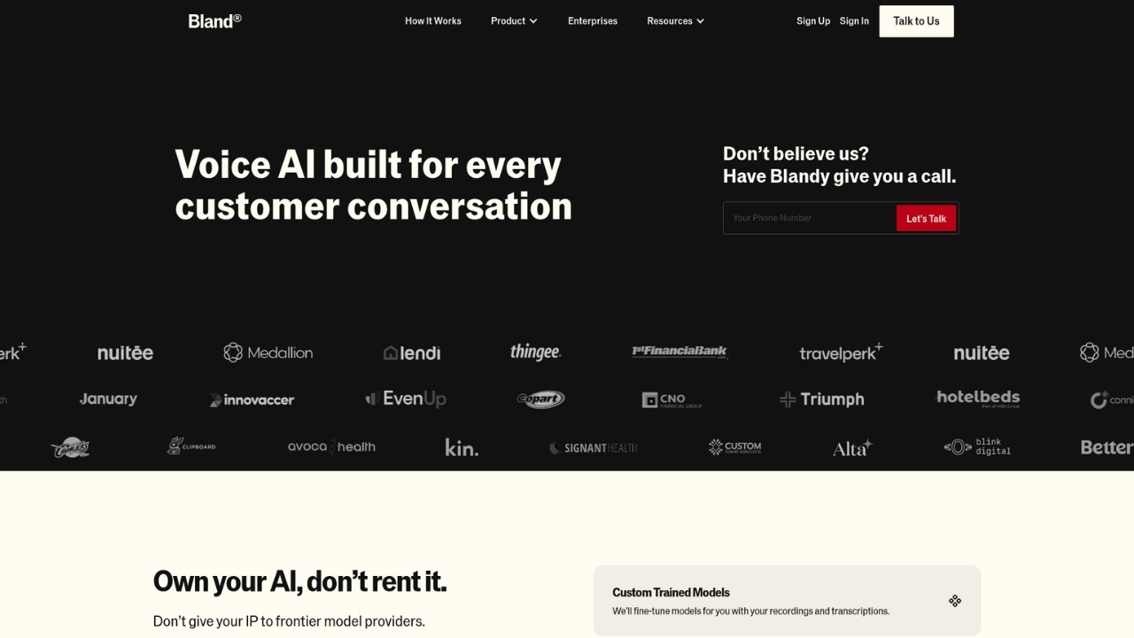Bland AI suits large enterprises that need massive call volume handling with strict security requirements. If you're a Shopify store doing $10M a year, this is probably more than you need. If you're a Fortune 500 company, it's worth the conversation.