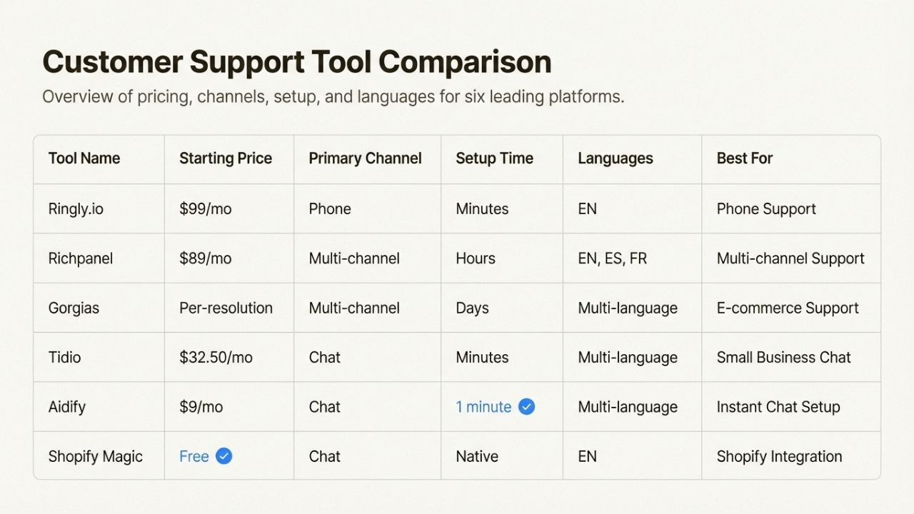Pricing ranges from free (Shopify Magic/Inbox) to $1,099+ per month (Ringly.io Scale plan). Most stores can start with Aidify at $9/month or Tidio at $32.50/month. Mid-size stores typically pay $89-349/month for full-featured platforms like Richpanel or Ringly.io.