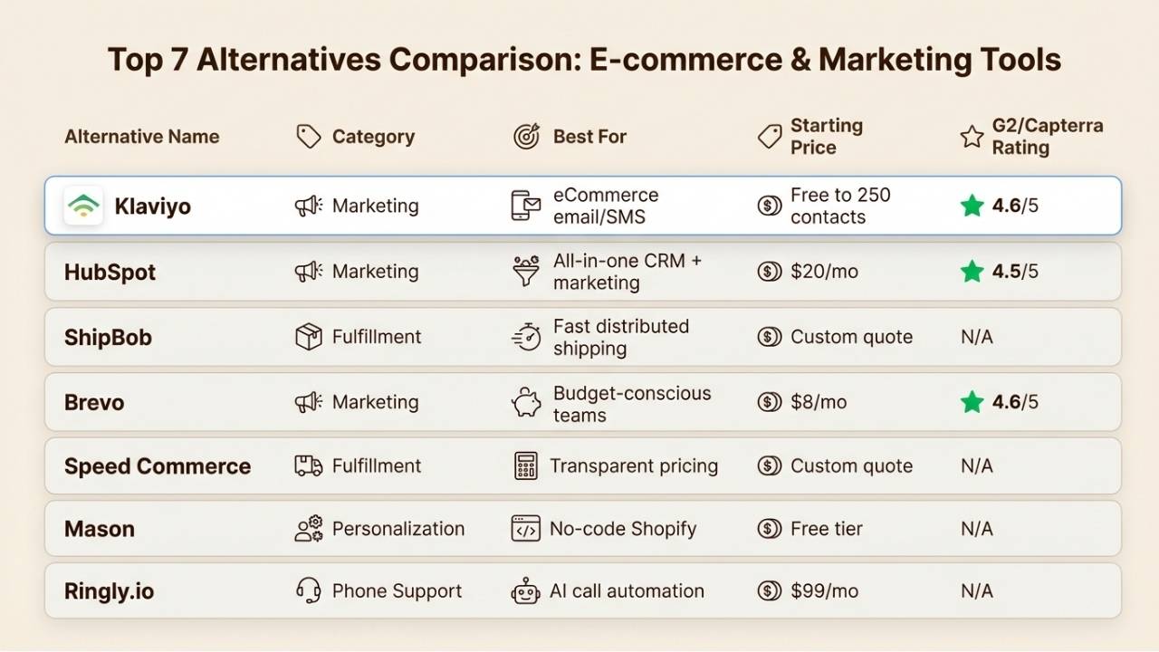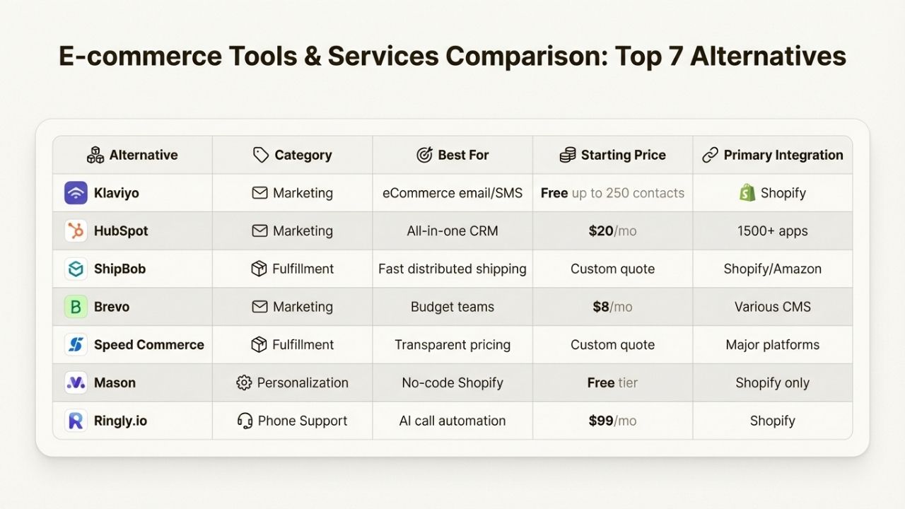 Yes. Many eCommerce stores combine alternatives across categories. For example, you might use Klaviyo for email marketing, ShipBob for fulfillment, Mason for personalization, and Ringly.io for AI phone support. Each serves a different function and integrates with Shopify independently.