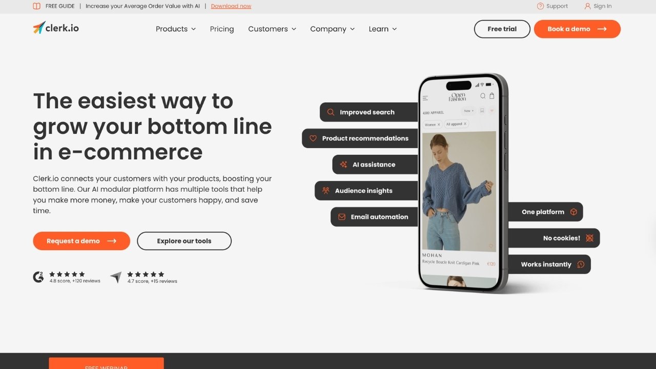 Clerk.io offers a complete personalization platform that goes beyond search to include recommendations, email marketing, and AI chat.