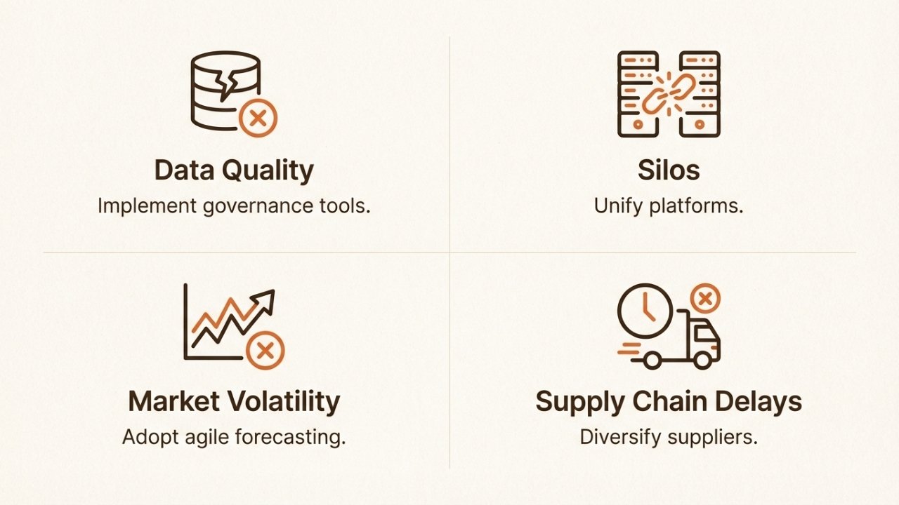 Incomplete or inaccurate data corrupts everything. A single SKU mapped incorrectly across platforms can throw off your entire forecast. The fix? Implement data validation rules, deduplicate regularly, and maintain consistent SKU naming conventions across all systems.