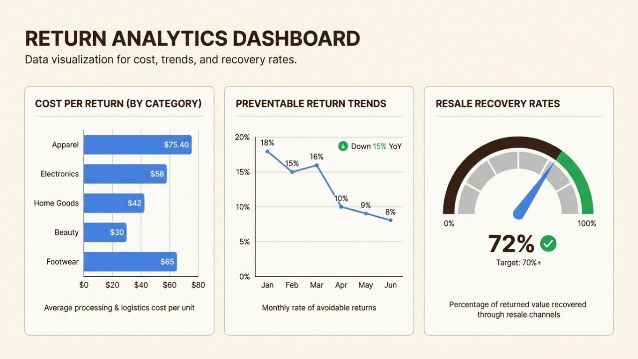 Track return rate by category, preventable return rate (sizing, PDP issues, packaging), cost per return (including hidden costs), resale value recovery rate, and time from arrival to resolution. Set alert thresholds so your team knows when something needs attention.