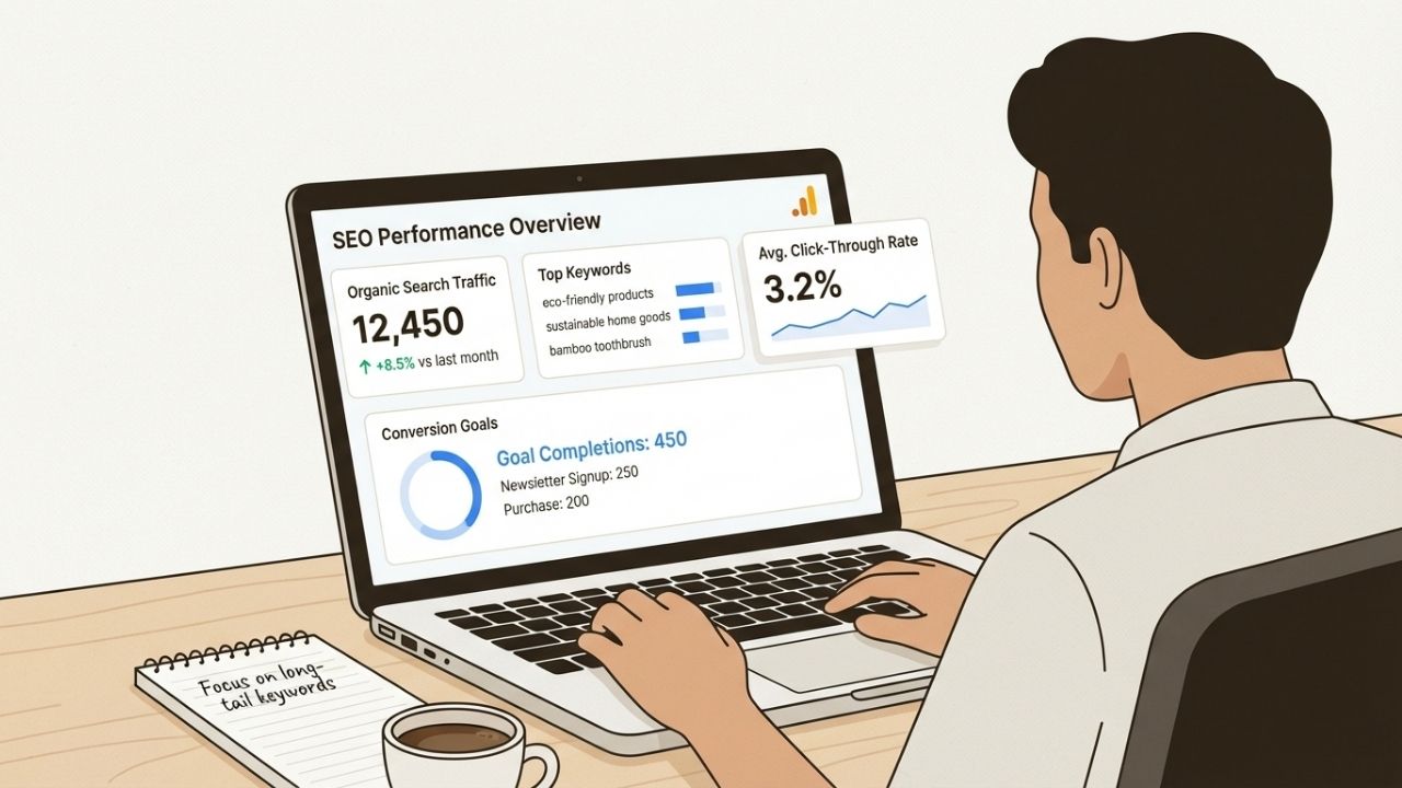 Use GA4 to track ecommerce revenue, funnel behavior, and conversion paths. Use Search Console to monitor changes in top queries, page impressions, and click-through rates.