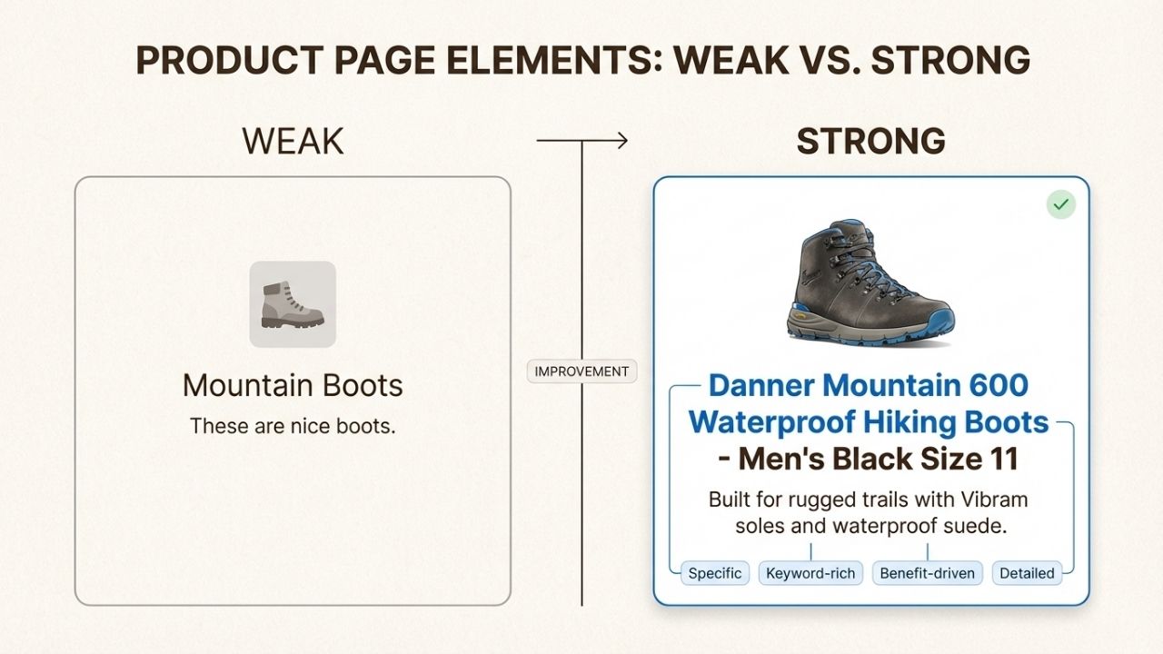 Avoid robotic keyword strings and instead use phrasing that offers clarity and connection. A title like "Danner Mountain 600 Waterproof Hiking Boots – Men's Black Size 11" works better than "Mountain Boots" because it matches exactly what the searcher typed.