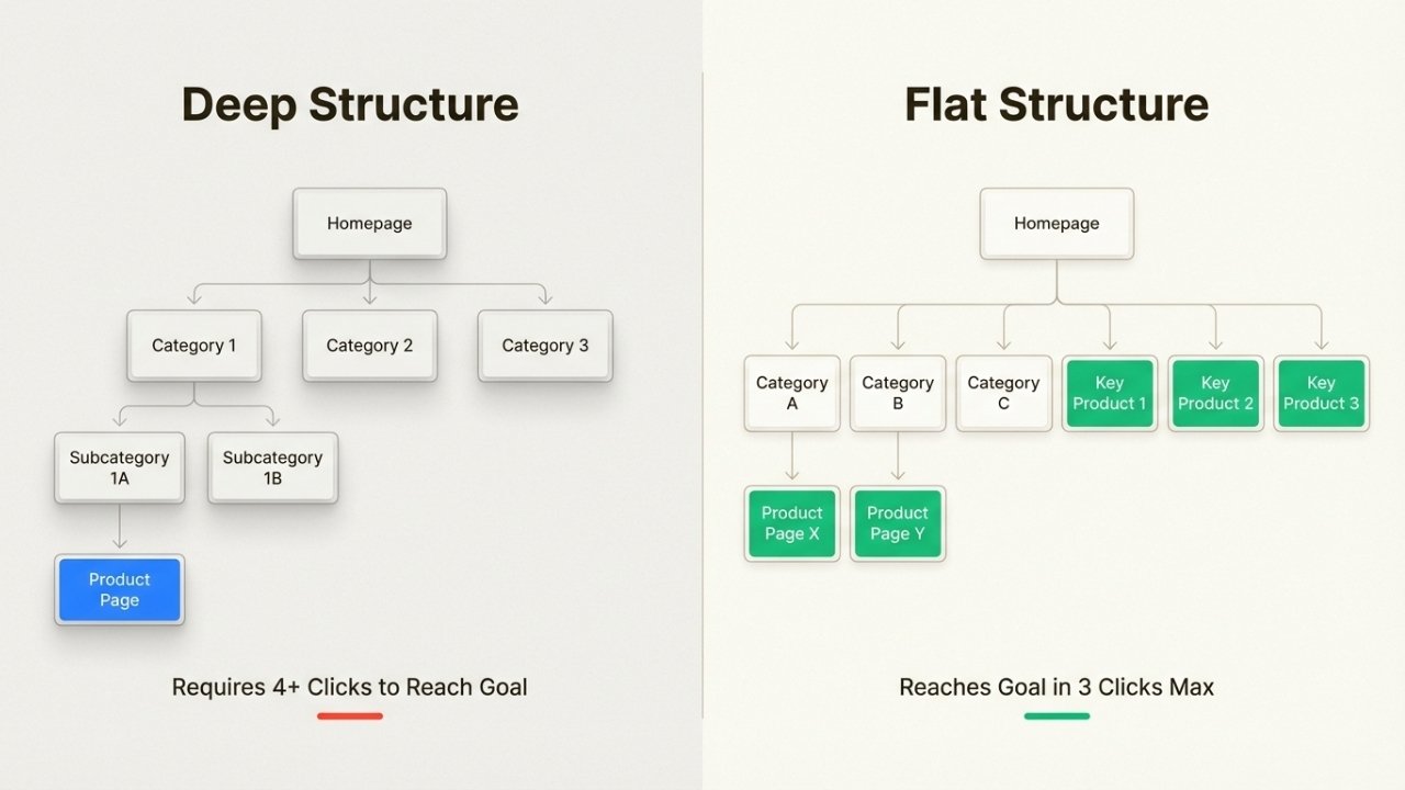 Site architecture is the foundation. A flat structure ensures that every product is reachable in three clicks or fewer from the homepage.