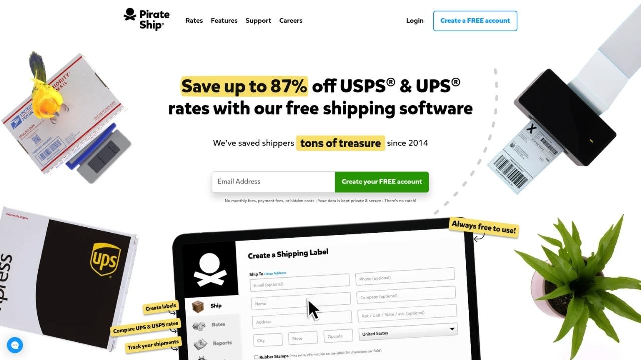 Pirate Ship is completely free. No monthly fees, no per-label fees, no hidden costs.