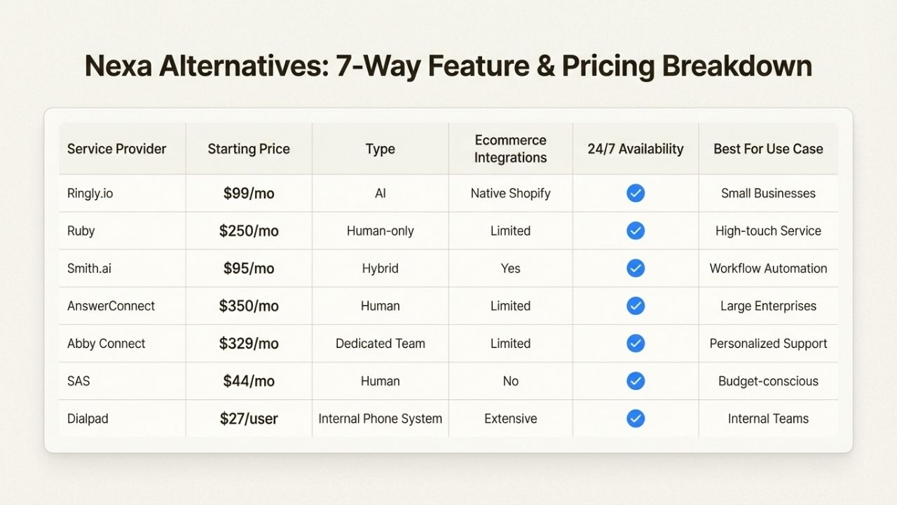 Only if it integrates with your store. Most general answering services cannot look up orders. Ringly.io is the only Nexa alternative on this list with native Shopify integration for real-time order data.