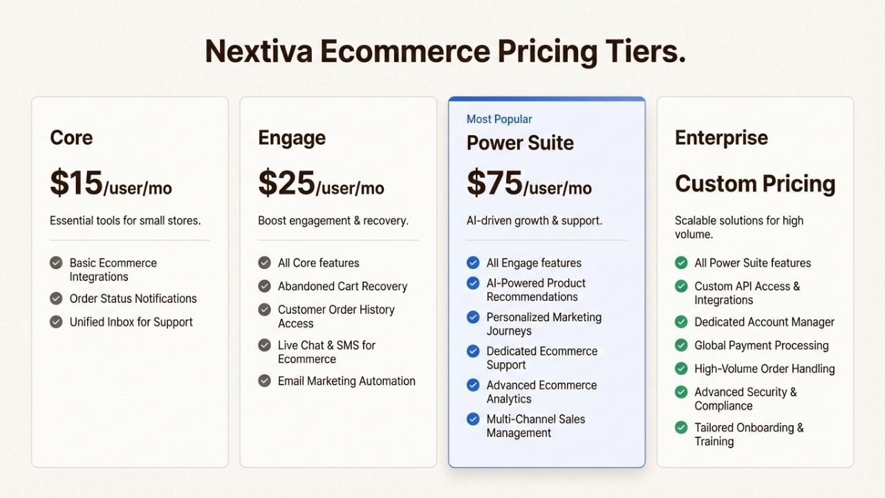 Nextiva ecommerce pricing starts at $15/user/month for the Core plan with annual billing. The Engage plan at $25/user/month adds ecommerce review management. Power Suite CX costs $75/user/month. Enterprise pricing is custom and requires contacting sales.