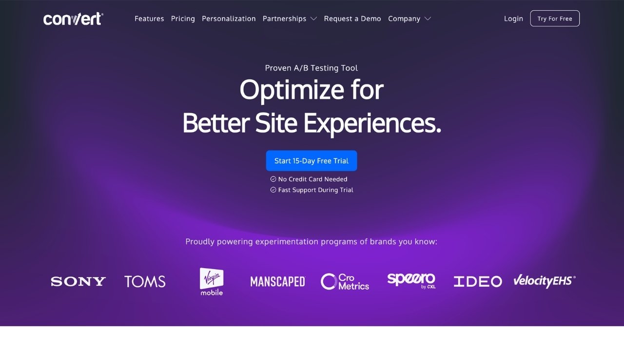 Pricing: Convert's pricing is based on monthly tested users. Growth starts at $299 per month, Pro at $420 per month, with Enterprise available for custom pricing. A 15-day free trial requires no credit card.