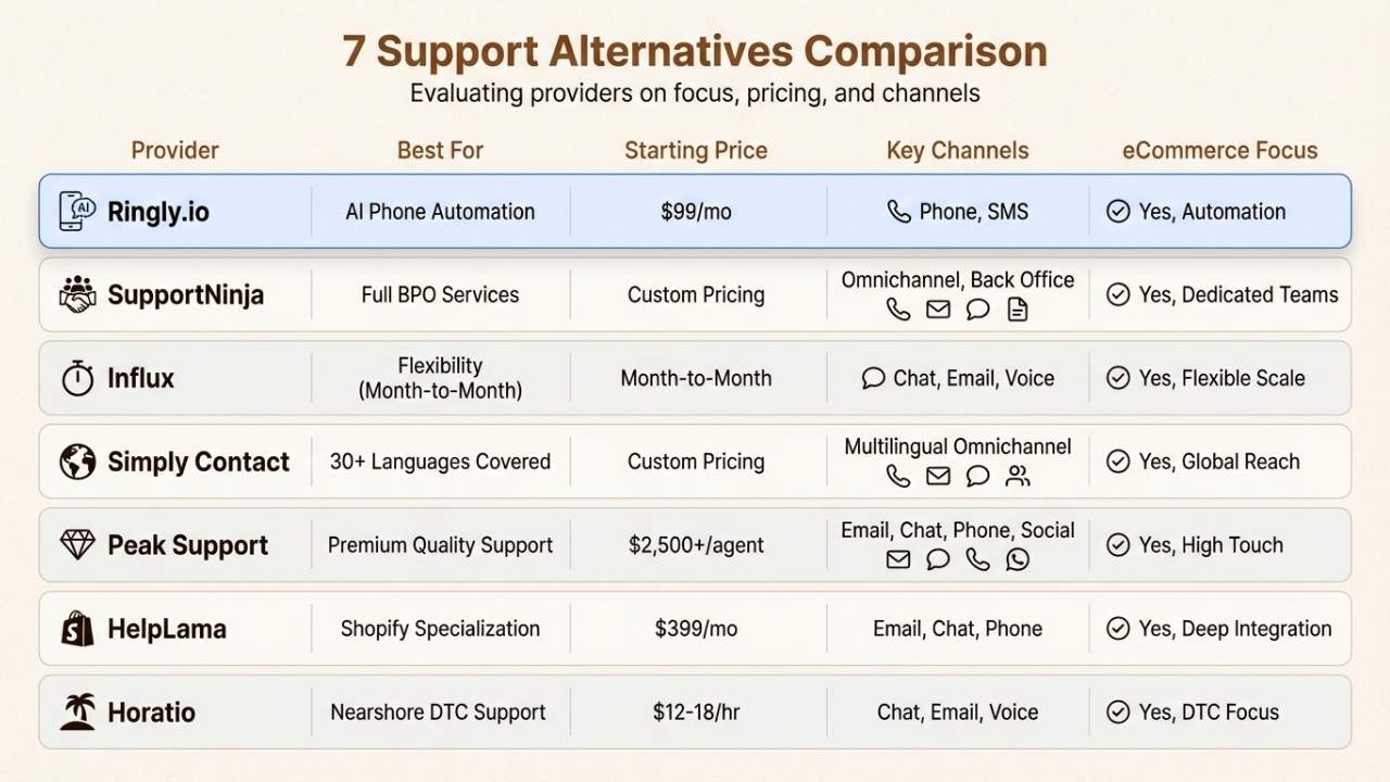 Before diving into specific alternatives, here's what matters most for eCommerce support outsourcing.