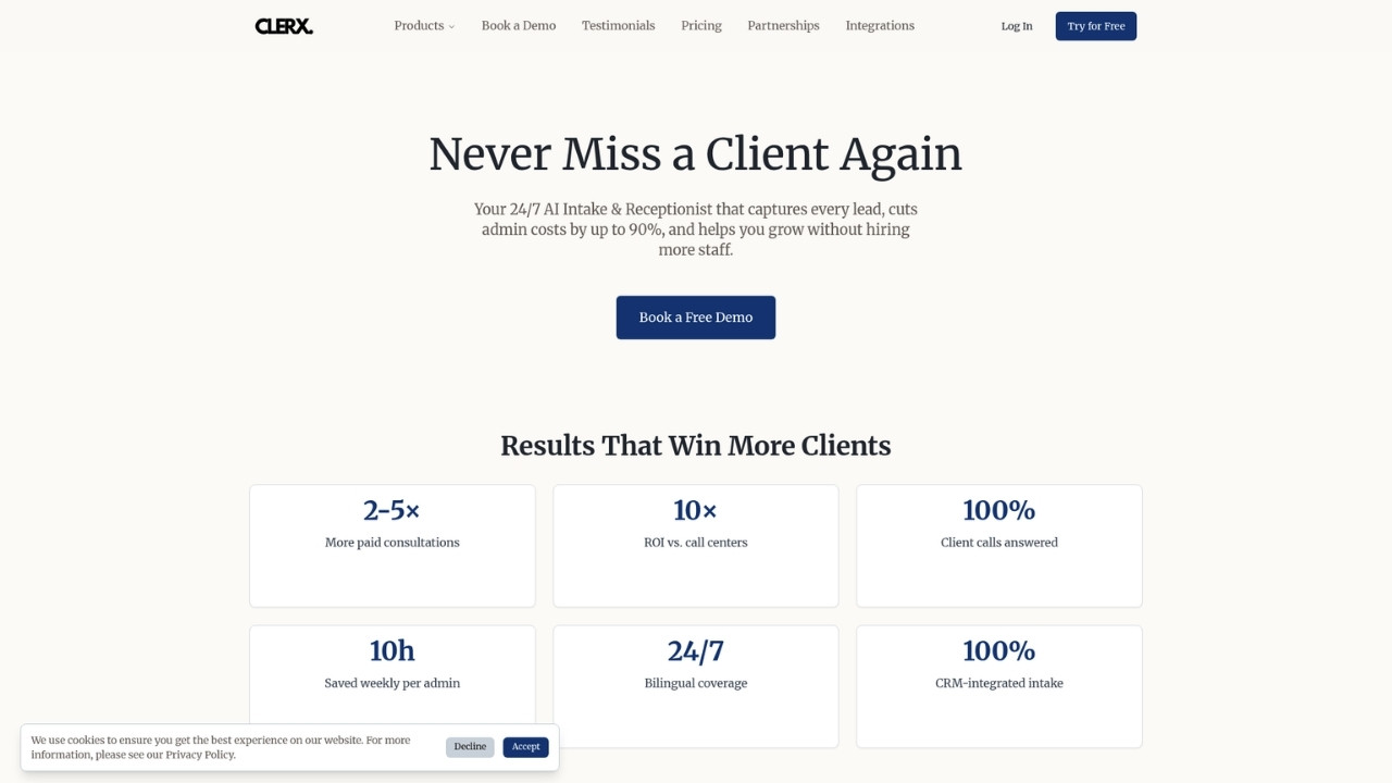All plans include a 7-day free trial. Clerx claims businesses save $2,500-$25,000 monthly compared to human receptionists.