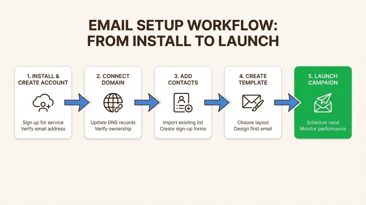 Step 3: Send your first campaign. Use a pre-built template, customize with your branding, and test thoroughly.