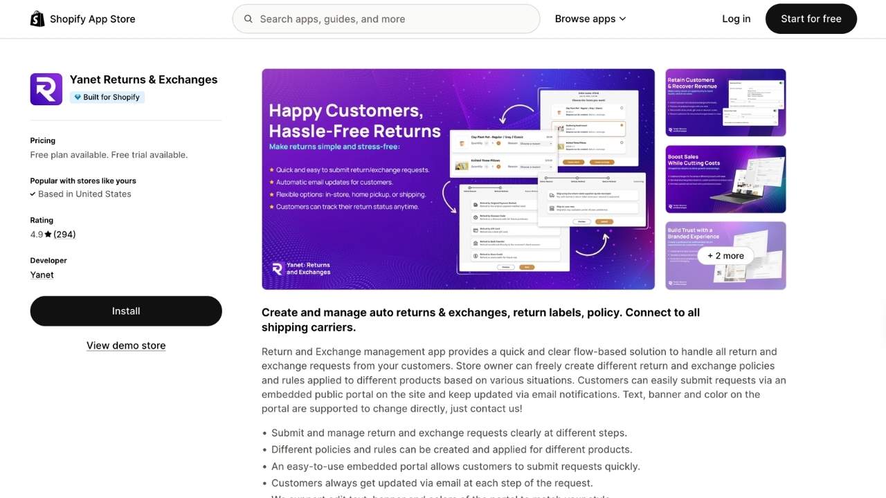 Yanet offers a straightforward returns solution with solid ratings and a free plan. It's the budget-friendly choice for stores wanting basics without complexity.