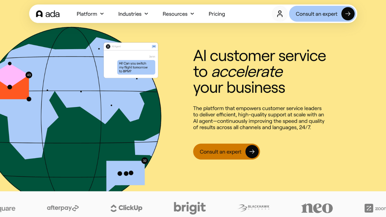 Ada operates at enterprise scale, handling 5.5B+ interactions since 2016 across retail, fintech, healthcare, and telecom.