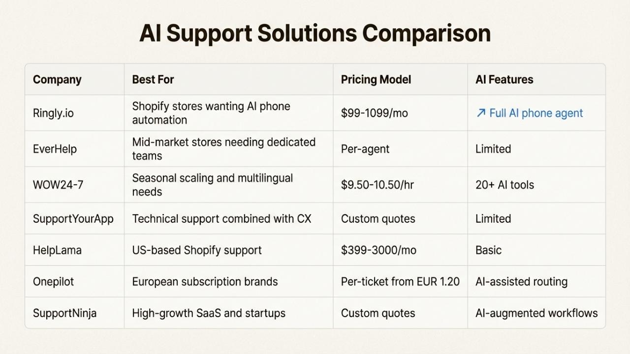Ringly.io and HelpLama both specialize in Shopify. Ringly.io offers AI phone automation with native Shopify integration for order data. HelpLama provides US-based human agents with Shopify expertise. Your choice depends on whether you prefer AI efficiency or human touch.